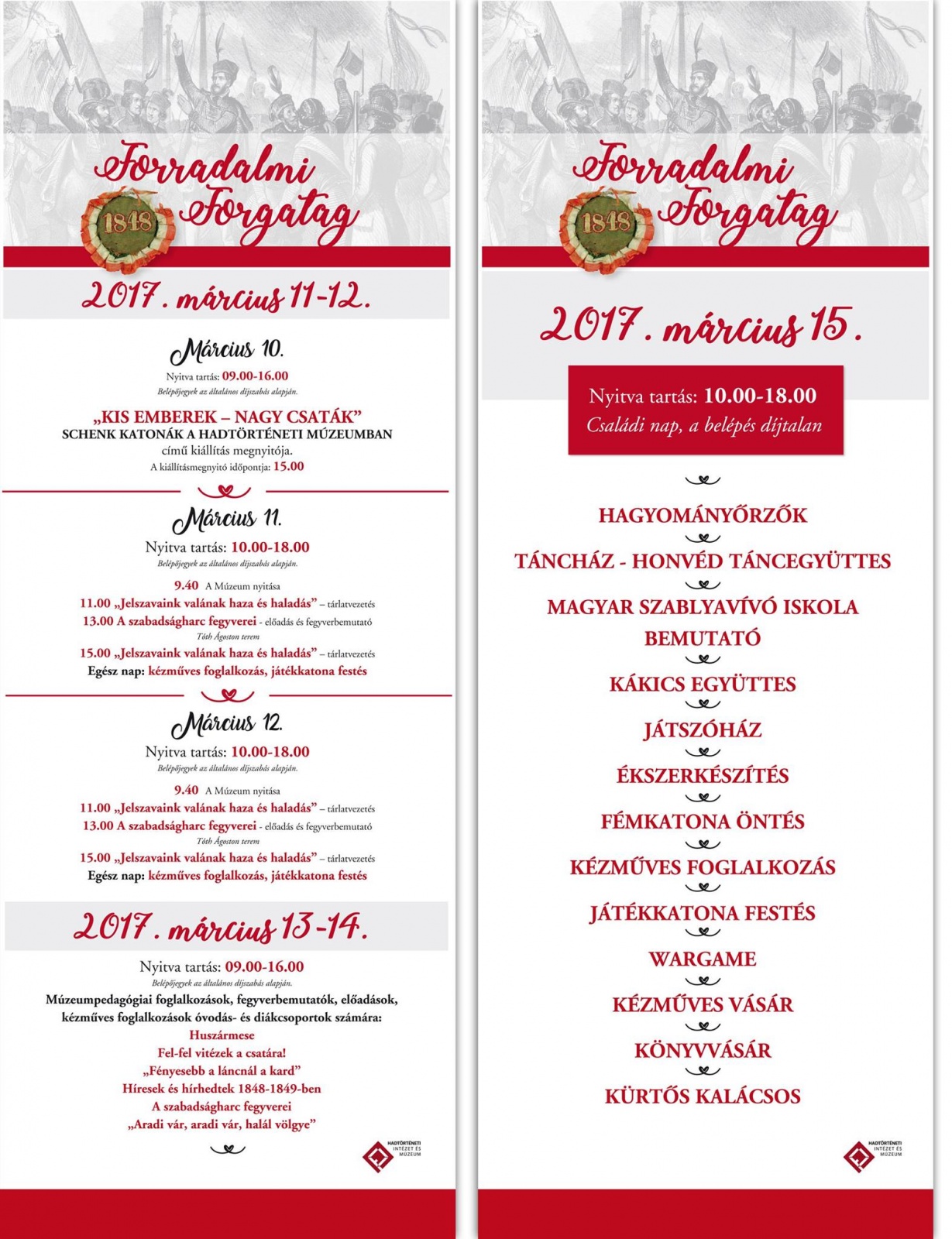 Március 13-án és 14-én múzeumpedagógiai és kézműves-foglalkozásokkal, fegyverbemutatókkal és különböző előadásokkal várják az óvodás- és diákcsoportokat.