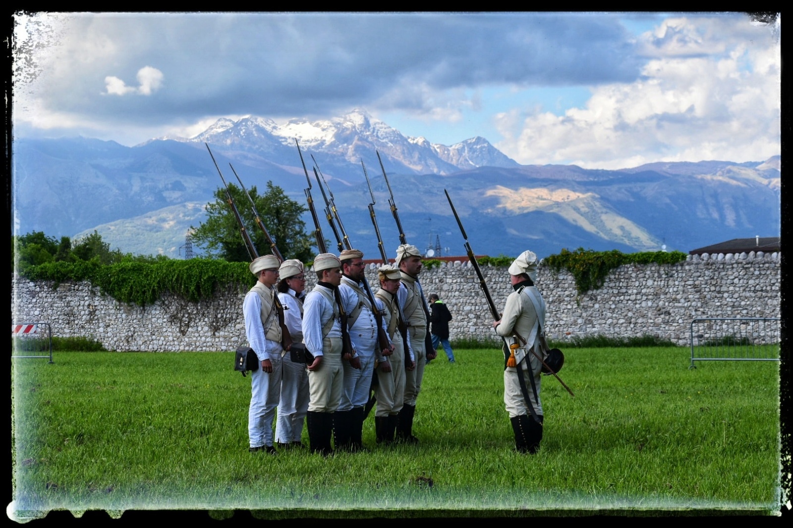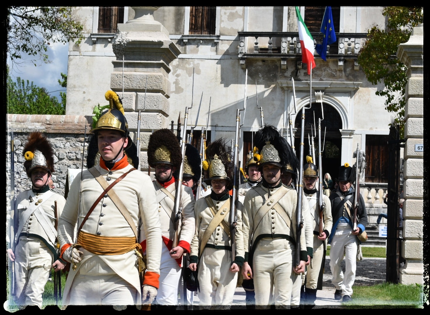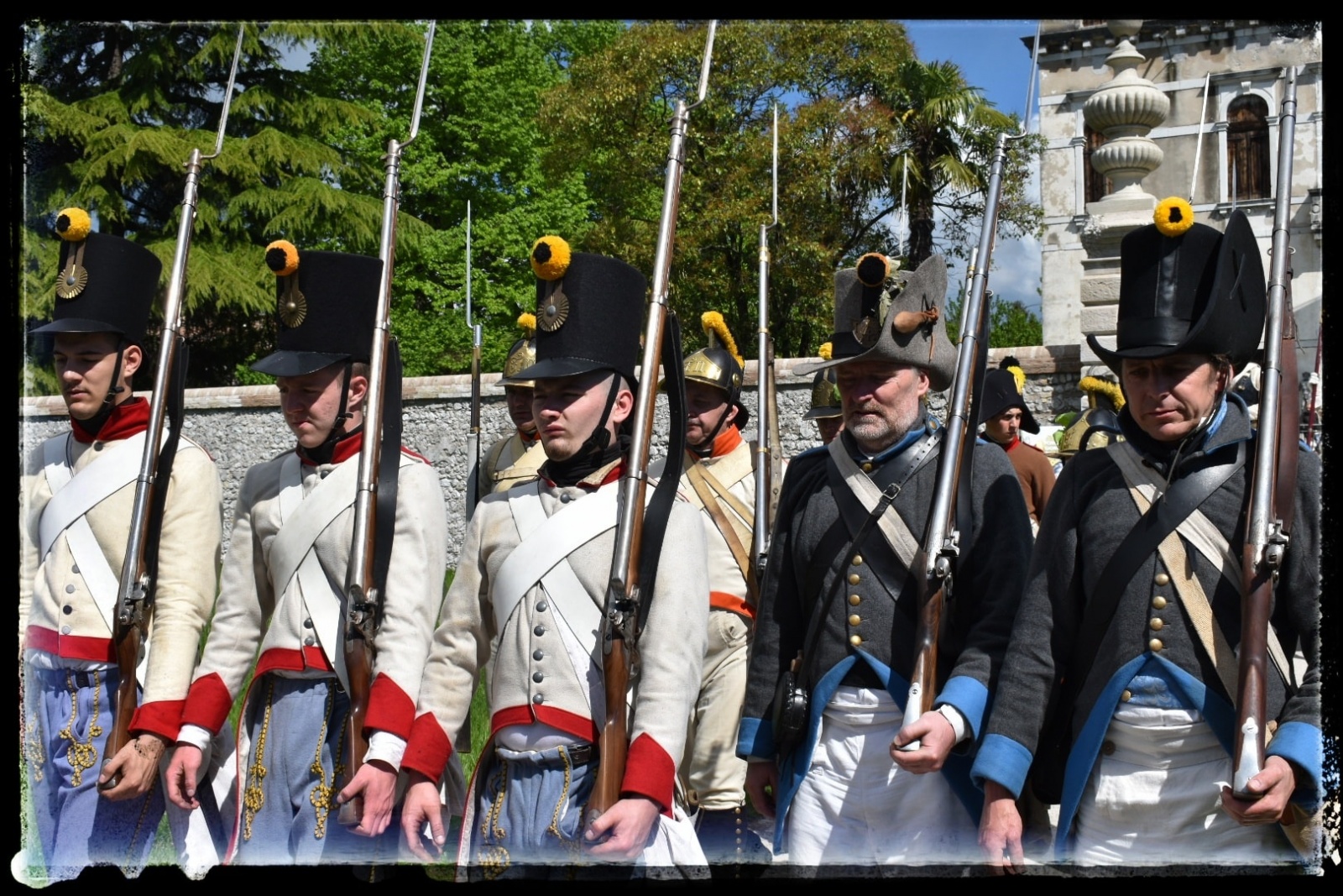 A szombati nap díszmenetet tartott a két hadsereg Porcia központjában, ahol meglátogattuk az 1809-es csata emlékművét és leróttuk tiszteletünket az elesett katonák előtt. A város főterén a francia hadsereg mutatta be, hogy is néz ki náluk egy előléptetés átadás és tiszti kinevezés. Délután a kastélyparkban a gyakorlásé volt a fő szerep. Mi, magyar sorgyalogosok, a cseh Kaunitz-bakákkal együtt készültünk az ütközetre, külön hangsúlyt fektetve a töltés lövés gyakorlására.