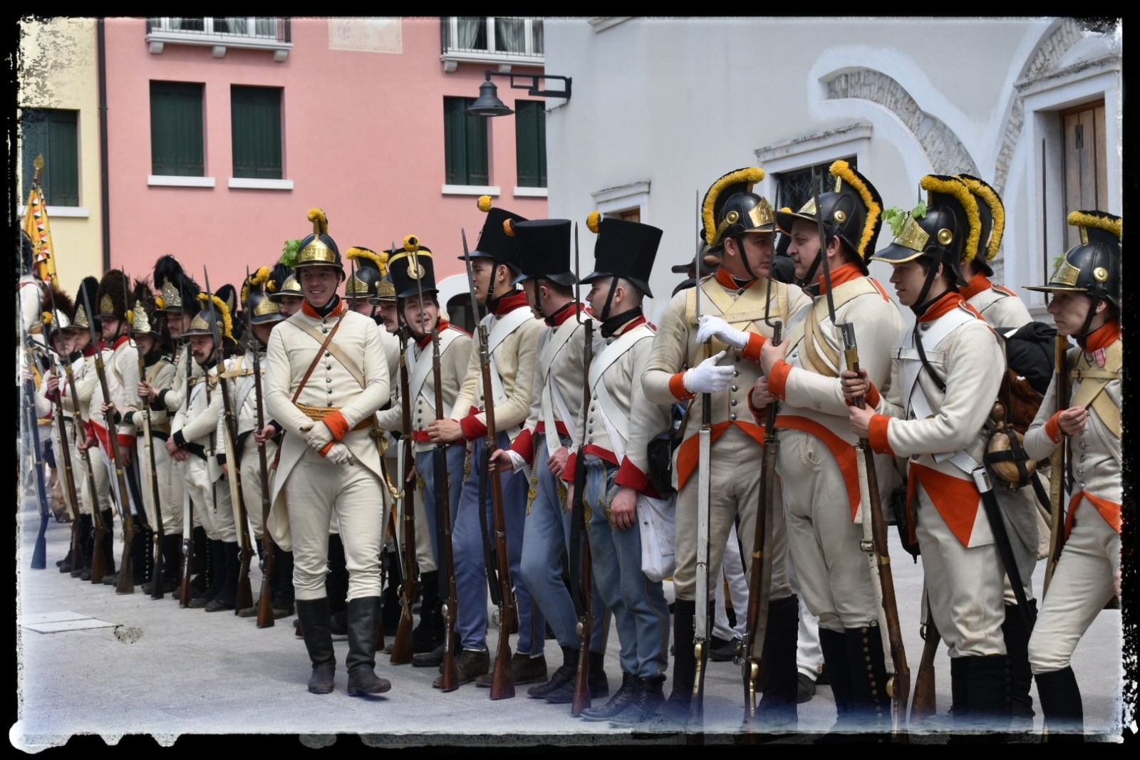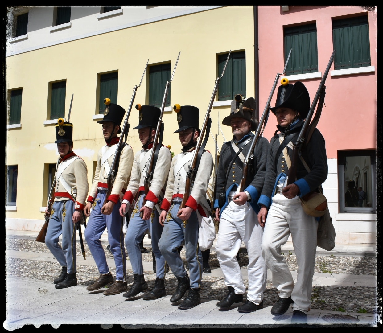 A pénteki napon Sacile kisvároson keresztül üldöztük a visszavonuló francia csapatokat, heves harcokkal és sortüzekkel a város történelmi központján át. Az ütközet alkonyatkor kezdődött és mire a városközpontba értünk, teljesen besötétedett. Sok helyen a közvilágítást is lekapcsolták. A sötétségben gyönyörűek voltak a felváltva ropogó sortüzek! Mind a két fél professzionálisan mozgott, töltött, lőtt, szuronyrohamozott. És újra. mozgott, töltött lőtt… A helyiek sorfala végig kísért minket a hadijáték idején. A tetőpont az eső eleredtével érkezett el! A csata a kezdődő viharban sem állt meg, és amíg a nedvesség engedte, kovás fegyvereinkkel folyamatosan lőttük a franciát! Leírhatatlan élmény volt, mikor az utolsó támadásnál, ahol már csak a szuronyok maradtak mind a két oldal számára, a teljes császári hadsereg, cseh, olasz, magyar sorgyalogosok és osztrák gránátosok, egy emberként üvöltötte, hogy “Links, Links, Links” és nyomult az ellenséges vonalak felé a szakadó esőben, villámlásban és sötétben! Az utolsó rohammal kitoltuk a franciákat a városból, akik futásnak eredtek. A hagyományőrző csata azt az egy történelmi mozzanatot nem elevenítette fel, hogy a kisvárosból nyugatra vezető egyetlen hidat 2019-ben, 1809-cel ellentétben, már nem robbantották fel.