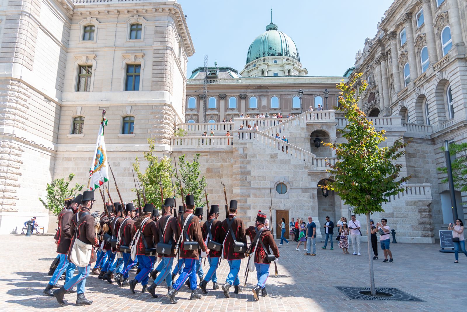 A Dísz-térről a díszegység a Sándor-palotához vonult, ahol tisztelgett a Köztársasági Elnöki Hivatal épülete előtt. A csapat a Turul-szobor melletti lépcsőn keresztül vonult tovább a Savoyai-szoborig, ahol befordulva tisztelgett az emlékmű előtt. Itt lehetőség volt a turisták számára közös fotózásra, nagy lelkesedéssel használták ki az alkalmat.