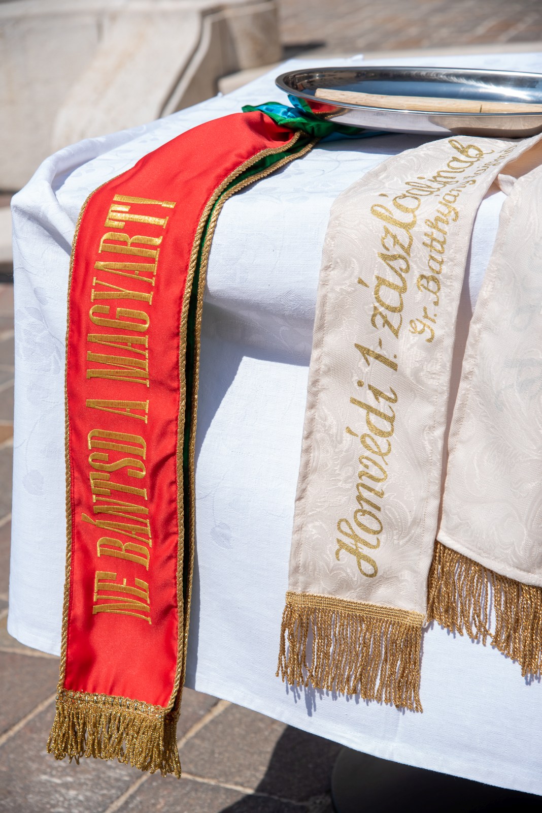 Tárogató felhívójel jelezte a küldöttség beérkezését, a díszegység fegyverrel tisztelgett a zászló előtt, majd a Himnusz eléneklése után elhangzottak az ünnepi beszédek, majd megkezdődött a Pesti 1. Honvédzászlóalj korhű zászlóavatása: a zászlószalag felkötése, a zászlószögek beverése, az eskütétel a csapatzászlóra. Az avatás zárásaként Heim Sándor hő. alezredes, zászlóaljparancsnok meglengette a zászlót majd Berlinger Gábor hő. százados, a Budai 2. Honvédzászlóalj parancsnoka kiléptette a csapat zászlósát és a két zászlóalj lobogóit a zászlócsúcsoknál összeérintették, ezzel is jelezve, hogy a két zászlóalj lobogójának avatására 1848 június 24-én együtt került sor és a jelenben is a két hagyományőrző zászlóalj szoros együttműködésben szolgál.