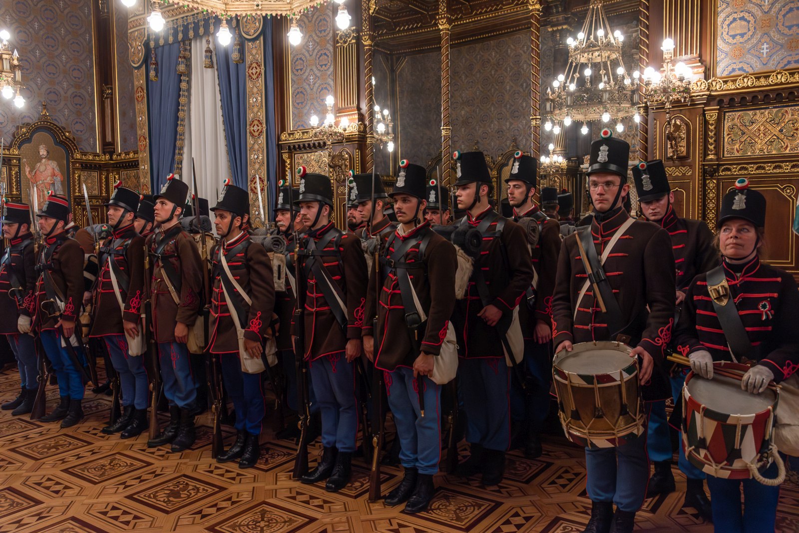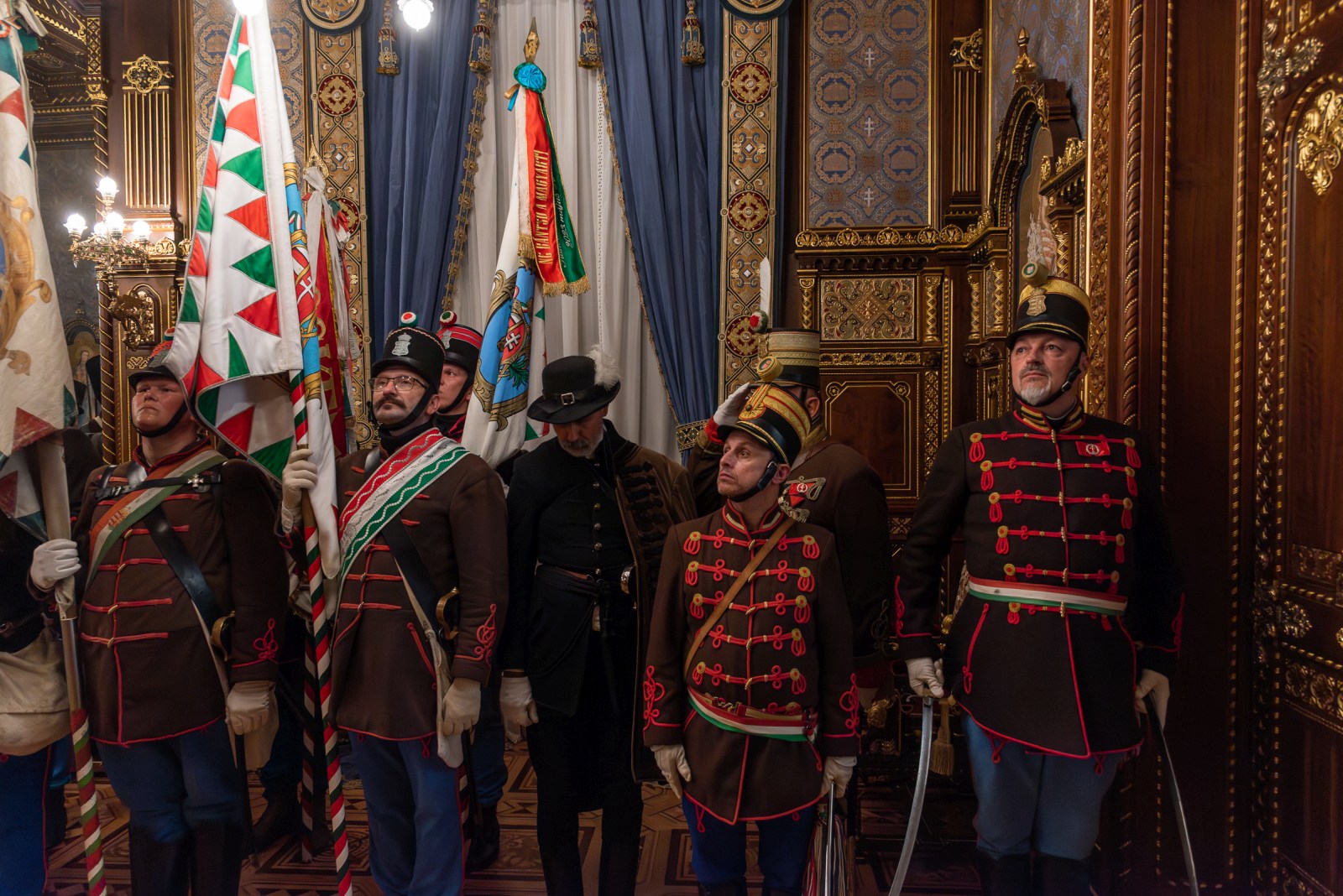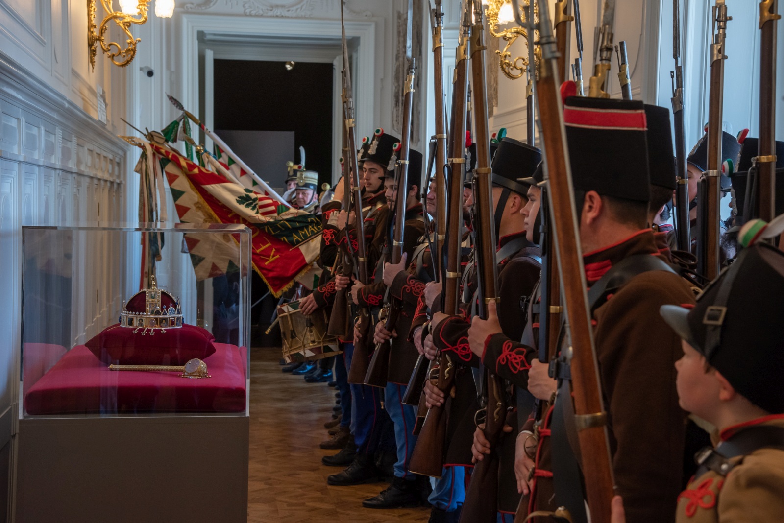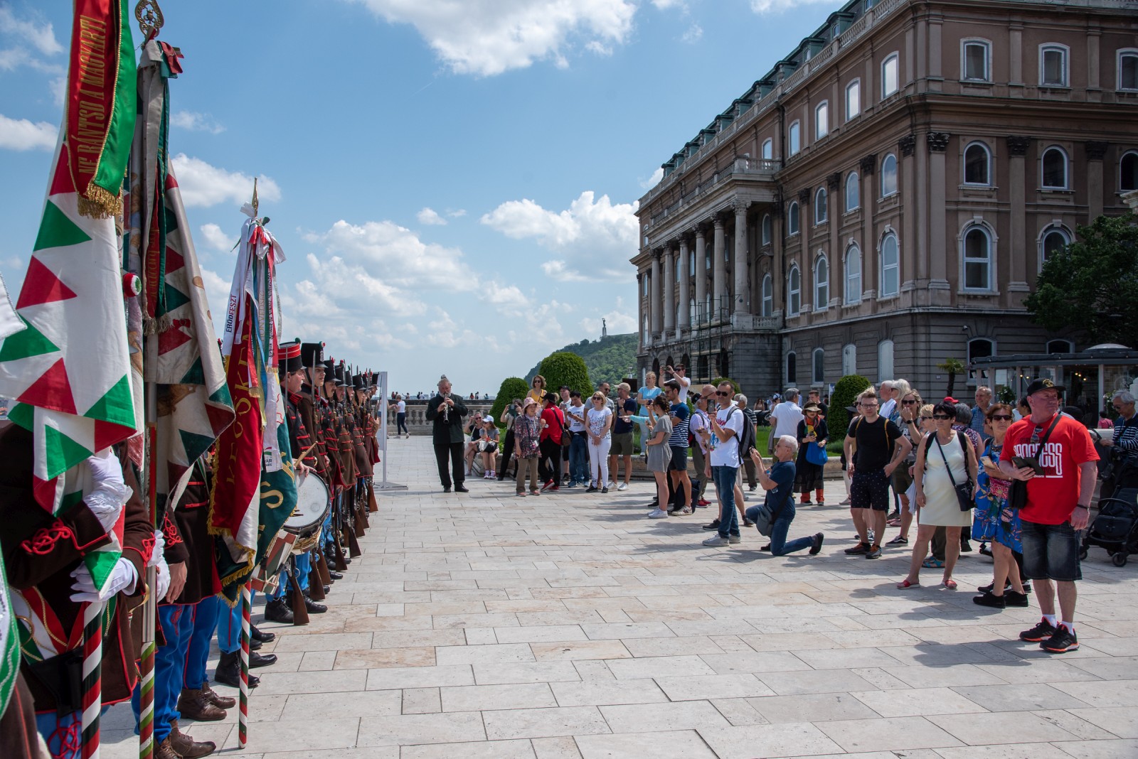 Az átjárón a Hunyadi udvarban a Mátyás kútja előtt díszelgett az egység, ahol szintén lehetőség volt közös fotózásra, majd az Oroszlános udvaron keresztül a Budavári Palota legcsodálatosabb részét, a Szent István-termet látogatta meg. A díszegység felsorakozott a Szent Korona másolatánál, majd a Szent-István-teremben és tisztelegve énekelte a ’Boldogasszony Anyánk’ régi magyar egyházi himnuszt tárogatószó kíséretében – felemelő pillanatok voltak!