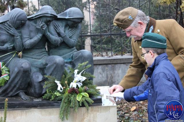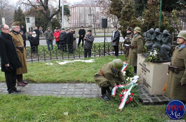Pápa Város Önkormányzata, valamint a Pápai Huszáregyesület az Esterházy út és a Szent István út sarkánál lévő második világháborús emlékműhöz szervezte meg vasárnapi tiszteletteljes főhajtását. A megemlékezés Kincses László szavalatával kezdődött, majd Tóth Gergely elénekelt egy katonadalt – utóbbit Kovács Gyöngyi hegedűn, míg Mózes László harmonikán kísérte.