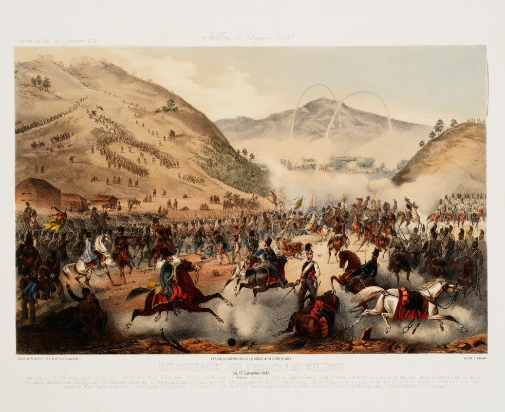 Hermann Dahlen naplója szerint negyedórával a bánnak a csatatérre érkezését követően ágyúdörgést hallottak a balszárny felől, mire előresiettek. (Érdekes, hogy a balszárnyon folyó gyalogsági küzdelem zaja nem hallatszott el az útig.) A bán Dahlennel parancsokat küldött szét, s mire az visszatért, már a centrumban is dörögtek az ágyúk és sisteregtek a röppentyűk. A bán és kísérete a horvát elővédhez sietett, amely becslésük szerint 900 lépésnyire lehetett a magyar vonalaktól. Látták, ahogy a horvát hatfontos gyalogüteg lövései becsapódnak a 4. (Sándor) huszárezred alezredesi osztályának soraiba, illetve, ahogy az egyik röppentyűüteg a magyar gyalogságot visszaűzi.