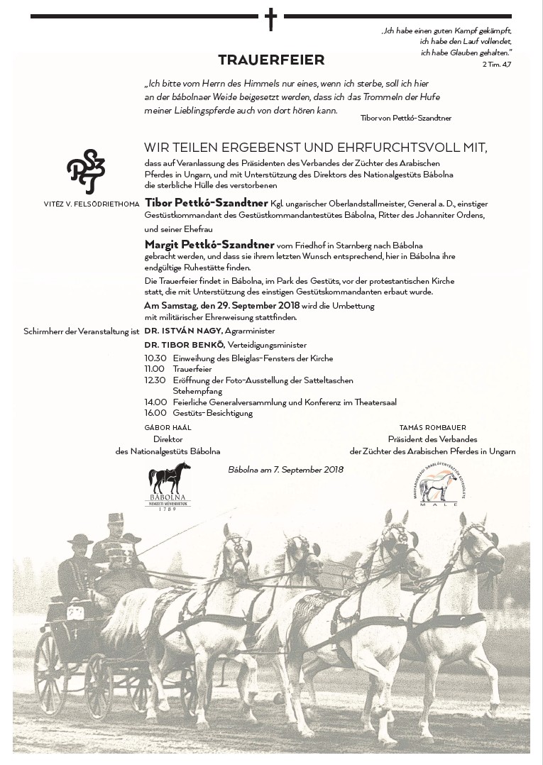 Ezúton értesítünk minden érdeklődőt, hogy a Magyarországi Arablótenyésztők Egyesülete elnökének kezdeményezésére, a Bábolna Nemzeti Ménesbirtok igazgatójának támogatásával vitéz Felsődriethomai Pettkó-Szandtner Tibor lótenyésztési főigazgató, nyugalmazott tábornok, a Bábolnai Ménes egykori parancsnoka, a Johannita rend lovagja, valamint hitvese Pettkó-Szandtner Margit hamvait a bajorországi Starnbergből Bábolnára hoztuk, hogy kívánságuknak megfelelően itt találjanak végső nyughelyre.