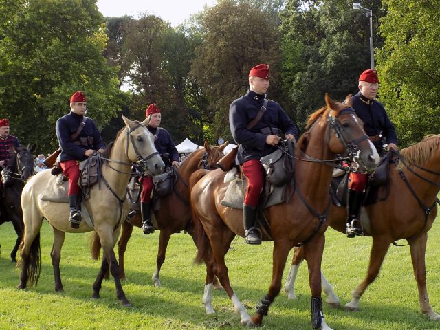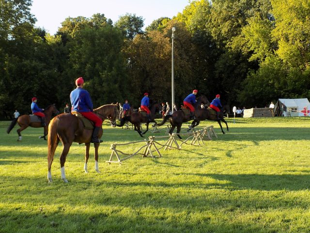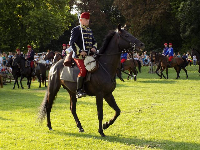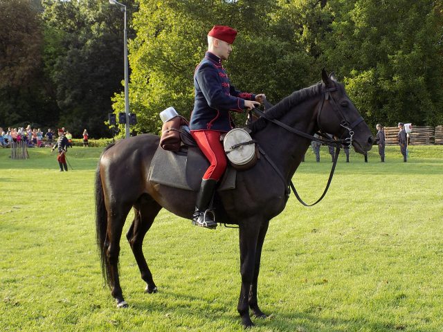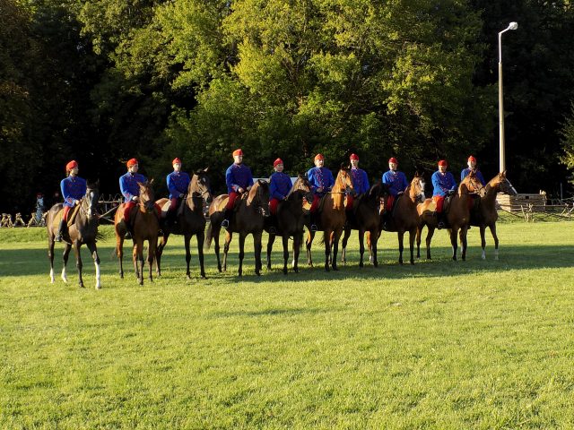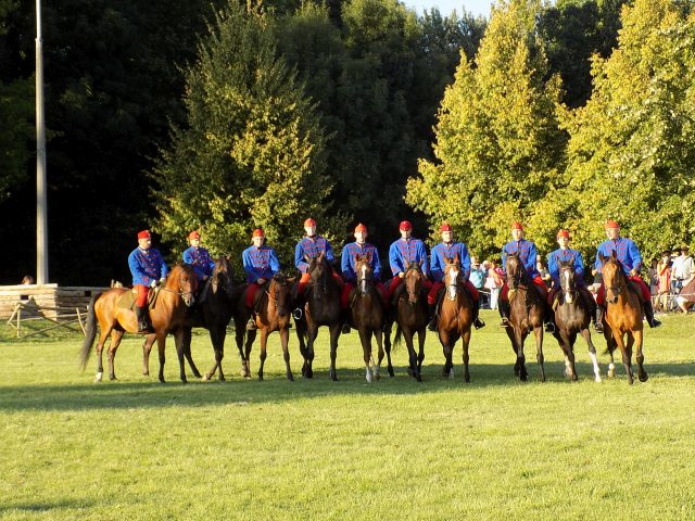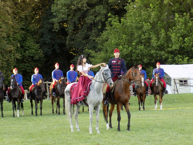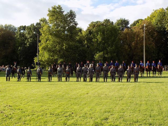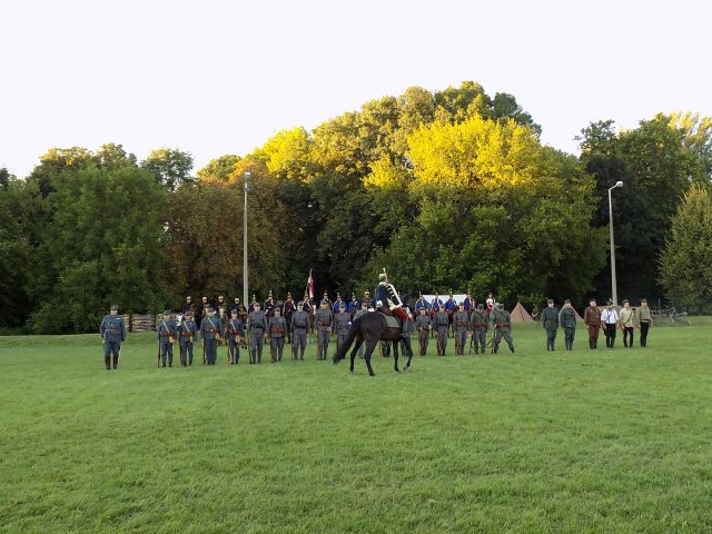 Időközben a Bajvívótéren a hagyományőrzők már készülődtek a késő délutáni bemutatóra. Pápa Város Fúvószenekarának toborzója után dr. Hermann István önkormányzati képviselő nyitotta meg a rendezvényt. A Pápai Huszáregyesület a pápai katona- és lovashagyományok megőrzését tűzte ki célul megalakulásakor, kiemelt feladatának tekinti, hogy az egykor Pápán állomásozó Magyar Királyi 7. Honvéd Huszárezred emlékét méltón őrizze és átadja az utókornak. Minden nagyobb bemutatójuk, melyek bár különféle korszakokat elevenítettek fel, mindig kapcsolódtak helyi eseményekhez is. Nem volt ez másként most sem. A Nagy Háború centenáriumának egyik állomása az idei év, épp ezért a dicsőséges 7. Honvéd Huszárezred emlékét idézték fel.
