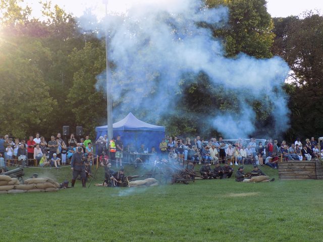 A Pápai Történelmi Napok kiemelkedő rendezvénye volt a szombat délutáni hadijáték, melyet több kísérőprogram is gazdagított. A 24 évvel ezelőtt alakult Pápai Huszáregyesületnek ez volt a 16. nagy bemutatója, ezúttal is egy hősies helytállást követelő korszakhoz, az első világháborúhoz kapcsolták a hadijátékot.