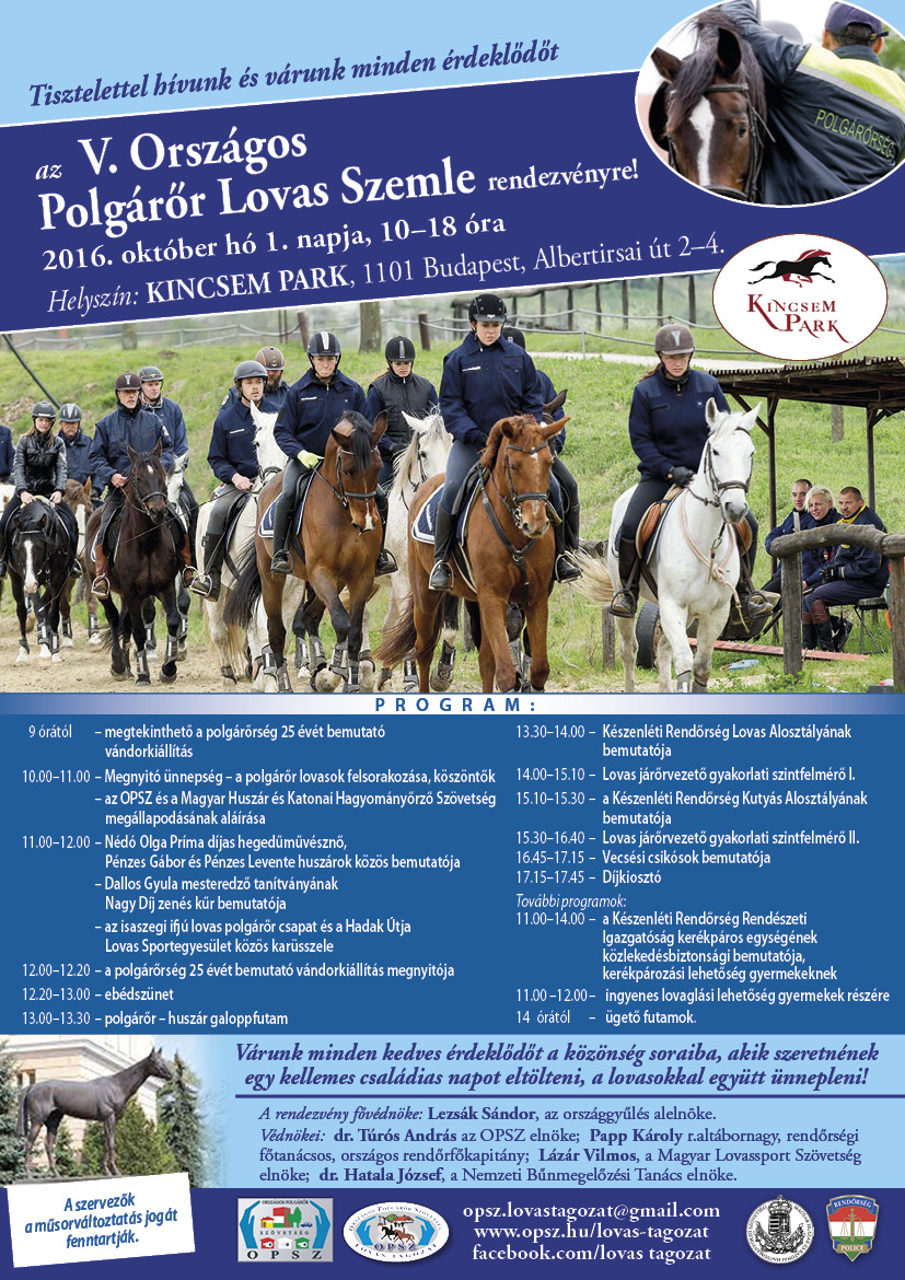 A szervezők tisztelettel hívnak és várnak minden érdeklődőt 2016. október 1-én 10 órára a Kincsem Parkba az V. Országos Polgárőr Lovas Szemle rendezvényre.