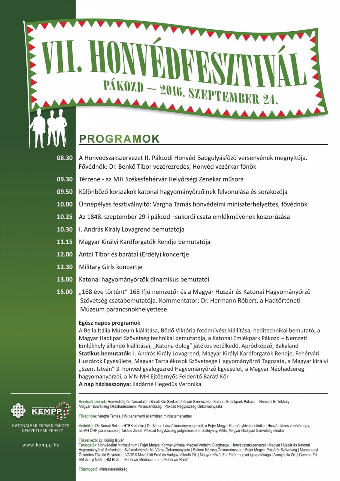 Az ünnepélyes fesztiválnyitó 10 órakor kezdődik, melyen Vargha Tamás honvédelmi miniszterhelyettes, a rendezvény fővédnöke mond köszöntőt, majd megkoszorúzzák a pákozd-sukorói csata emlékművét. A Magyar Honvédség Székesfehérvár Helyőrségi Zenekar térzenés műsorral fogja szórakoztatni a parkba látogatókat, míg a különböző korok katonai hagyományőrző egyesületei látványos bemutatókkal készülnek. Így láthatunk majd kardforgatást, felvonulást és sorakozást is tőlük. A gyerekeket „Katona dolog” játékos vetélkedőre várják, de lesz Apródképző és Bakaland is.
