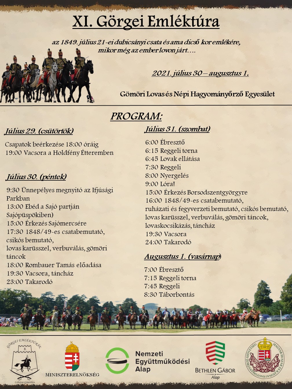 Az alábbi plakáton olvasható a Gömöri Lovas és Népi Hagyományőrző Egyesület szervezésében ismét megrendezésre kerülő Görgei Emléktúra programja. A túra időpontja: 2021. július 30-augusztus 1. A részvétel előzetes bejelentkezéshez kötött, melyet július 10-ig várnak a szervezzők a következő elérhetőségeken:gomoriegyesulet@gmail.com, vagy Varga Gábornál a 30/606-2638 telefonszámon vagy Barta Lászlónál a 30/289-5905 telefonszámon.